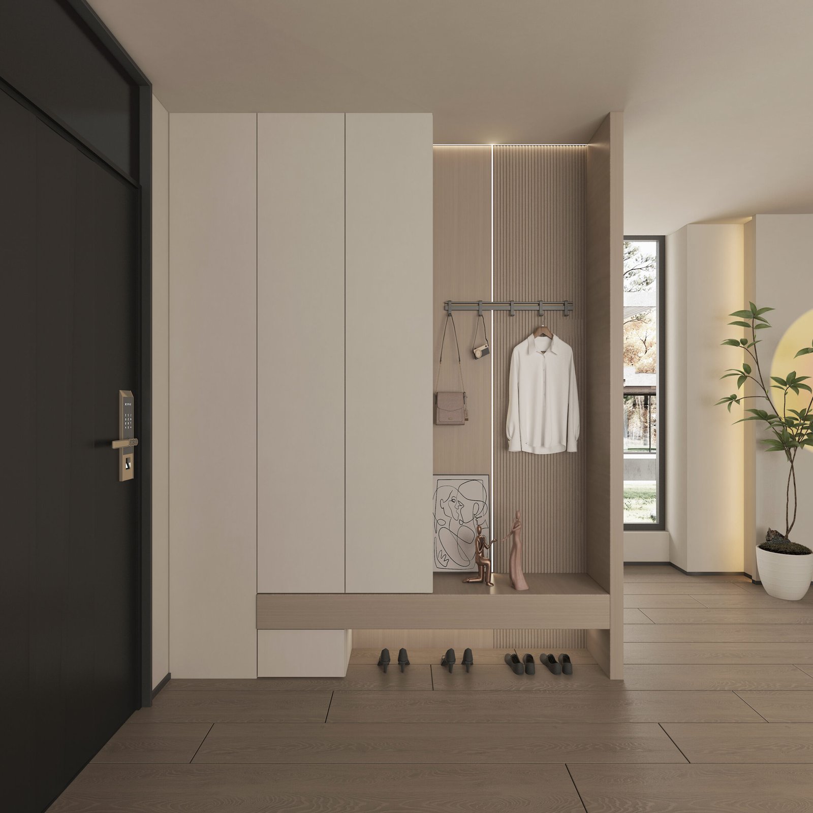 Designed with modern minimalism at its core, this all-aluminum entryway cabinet redefines the order and beauty of your entry space. Crafted from premium all-aluminum, it is waterproof, moisture-proof, and formaldehyde-free, offering long-lasting durability and resistance to deformation. The combination of a closed tall cabinet, open coat hanging area, and layered floating shoe bench enables refined storage for shoes, clothing, and daily essentials. Featuring a soft neutral color palette, vertical slats, and hidden LED lighting, it boasts clean lines and a warm texture, seamlessly complementing modern minimalist, wabi-sabi, and other contemporary home aesthetics while balancing functionality with sophisticated design.